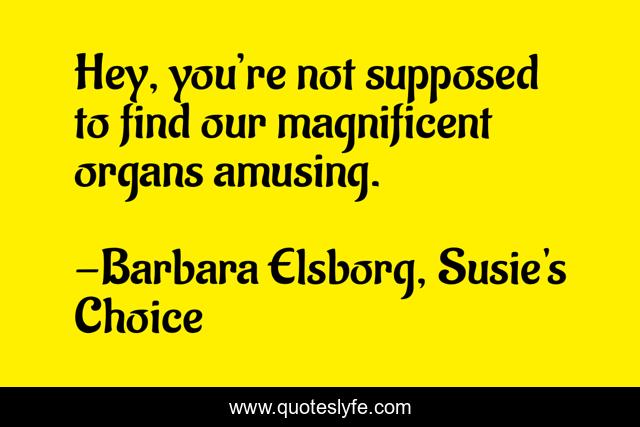This page presents the quote "Hey, you’re not supposed to find our magnificent organs amusing.". Author of this quote is Barbara Elsborg, Susie's Choice. This quote is about erotica, barbara-elsborg, susie-s-choice,.