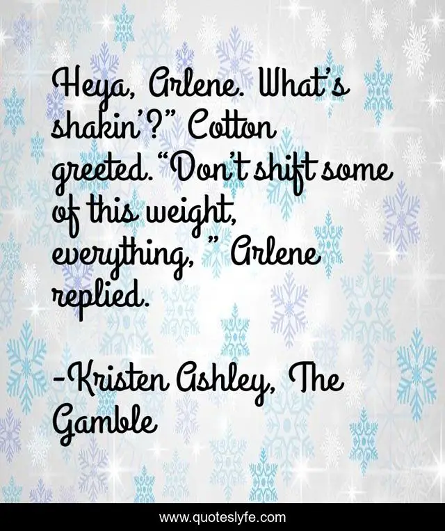 "Kristen Ashley, The Gamble Quotes." Quoteslyfe.com, 2025. Sat. 06 Dec. 2025. <https://www.quoteslyfe.com/quote/Heya-Arlene-What-s-shakin-Cotton-greeted-155045>.