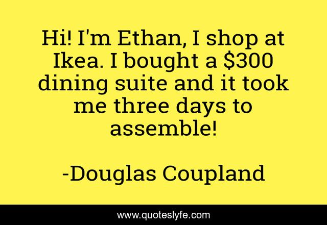 This page presents the quote "Hi! I'm Ethan, I shop at Ikea. I bought a $300 dining suite and it took me three days to assemble!". Author of this quote is Douglas Coupland. This quote is about sarcasm, ikea, humor,.