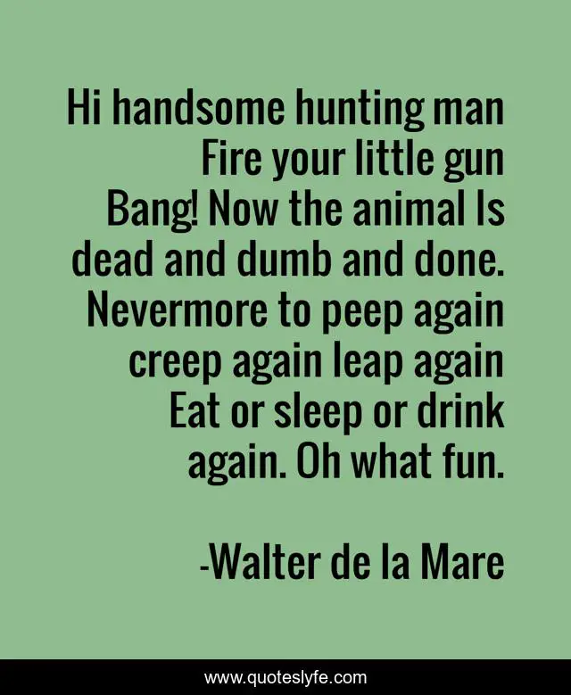This page presents the quote "Hi handsome hunting man Fire your little gun Bang! Now the animal Is dead and dumb and done. Nevermore to peep again creep again leap again Eat or sleep or drink again. Oh what fun.". Author of this quote is Walter de la Mare. .