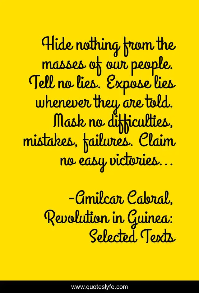 "Amilcar Cabral, Revolution in Guinea: Selected Texts Quotes." Quoteslyfe.com, 2025. Sun. 07 Dec. 2025. <https://www.quoteslyfe.com/quote/Hide-nothing-from-the-masses-of-our-242439>.