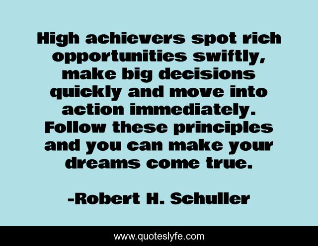 This page presents the quote "High achievers spot rich opportunities swiftly, make big decisions quickly and move into action immediately. Follow these principles and you can make your dreams come true.". Author of this quote is Robert H. Schuller. This quote is about decisions, opportunities,.