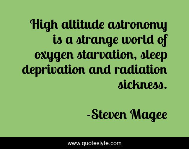This page presents the quote "High altitude astronomy is a strange world of oxygen starvation, sleep deprivation and radiation sickness.". Author of this quote is Steven Magee. This quote is about astronomy, oxygen, sickness, altitude, radiation, strange, sleep, world, starvation,.