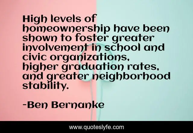 This page presents the quote "High levels of homeownership have been shown to foster greater involvement in school and civic organizations, higher graduation rates, and greater neighborhood stability.". Author of this quote is Ben Bernanke. This quote is about school, neighborhood,.