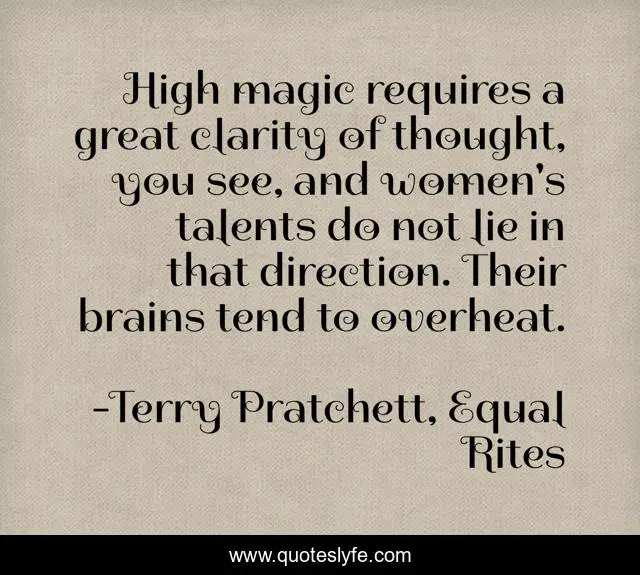 This page presents the quote "High magic requires a great clarity of thought, you see, and women's talents do not lie in that direction. Their brains tend to overheat.". Author of this quote is Terry Pratchett, Equal Rites. This quote is about thinking, brains, magic, women,.