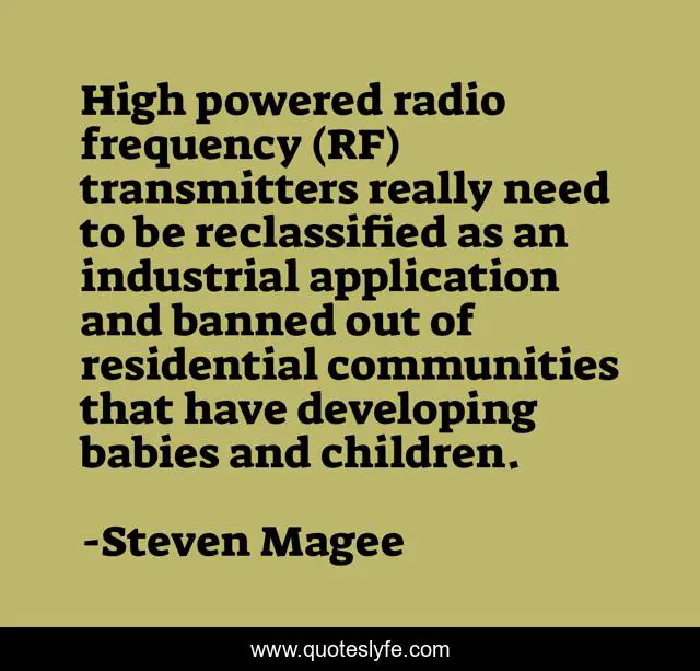 This page presents the quote "High powered radio frequency (RF) transmitters really need to be reclassified as an industrial application and banned out of residential communities that have developing babies and children.". Author of this quote is Steven Magee. This quote is about baby, industrial, transmitters, developing, residential, banned, powered, high, application,.