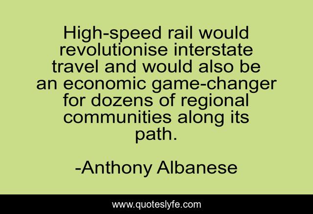 This page presents the quote "High-speed rail would revolutionise interstate travel and would also be an economic game-changer for dozens of regional communities along its path.". Author of this quote is Anthony Albanese. This quote is about path, along, economic,.