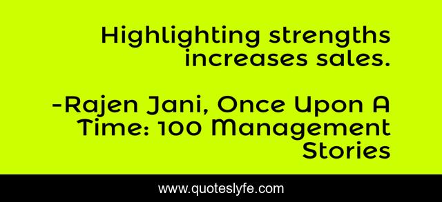 This page presents the quote "Highlighting strengths increases sales.". Author of this quote is Rajen Jani, Once Upon A Time: 100 Management Stories. This quote is about motivation, communication, sales, anger, improvement, quality, management, knowledge, strategy,.