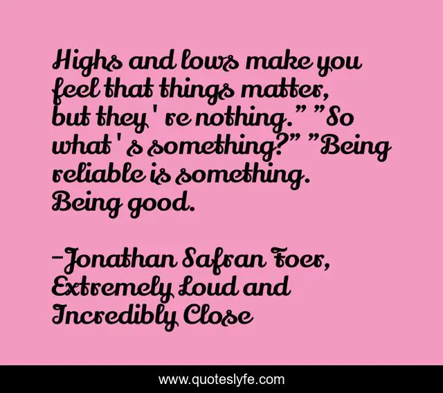 This page presents the quote "Highs and lows make you feel that things matter, but they're nothing." "So what's something?" "Being reliable is something. Being good.". Author of this quote is Jonathan Safran Foer, Extremely Loud and Incredibly Close. This quote is about good, feelings,.