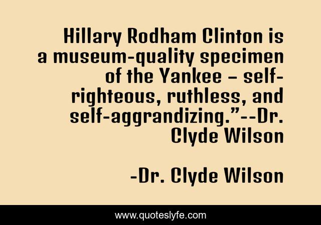 This page presents the quote "Hillary Rodham Clinton is a museum-quality specimen of the Yankee – self-righteous, ruthless, and self-aggrandizing.”--Dr. Clyde Wilson". Author of this quote is Dr. Clyde Wilson. This quote is about yankee-culture, anti-constitutional, power-hungry, historian, mob-rule, twisted-facts, abolitionists, evil-spirit, action,.
