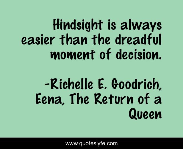 This page presents the quote "Hindsight is always easier than the dreadful moment of decision.". Author of this quote is Richelle E. Goodrich, Eena, The Return of a Queen. This quote is about richelle-goodrich, richelle, eena, decisions, hindsight,.