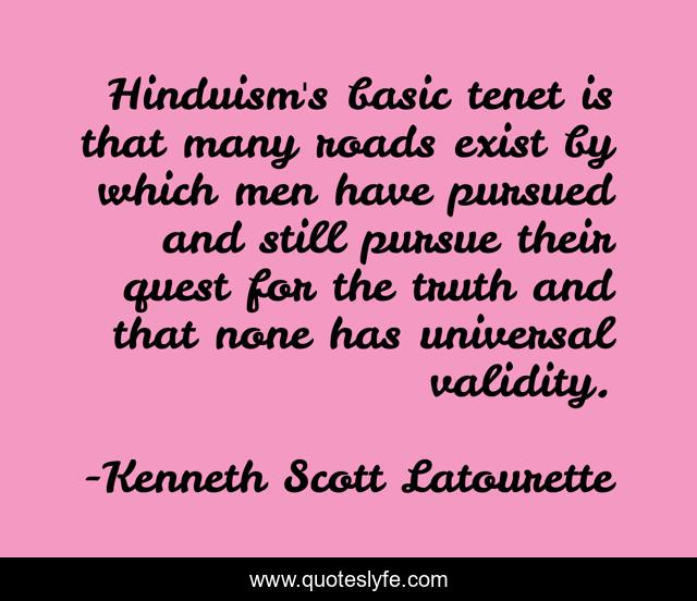 This page presents the quote "Hinduism's basic tenet is that many roads exist by which men have pursued and still pursue their quest for the truth and that none has universal validity.". Author of this quote is Kenneth Scott Latourette. This quote is about roads, quest, men,.