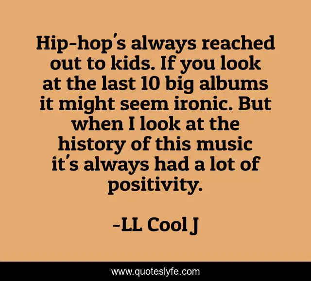 This page presents the quote "Hip-hop's always reached out to kids. If you look at the last 10 big albums it might seem ironic. But when I look at the history of this music it's always had a lot of positivity.". Author of this quote is LL Cool J. This quote is about hip-hop, history,.