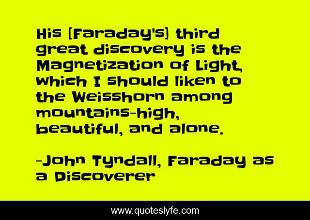 This page presents the quote "His [Faraday's] third great discovery is the Magnetization of Light, which I should liken to the Weisshorn among mountains-high, beautiful, and alone.". Author of this quote is John Tyndall, Faraday as a Discoverer. This quote is about science, michael-faraday, magnetism, light, faraday, discovery,.