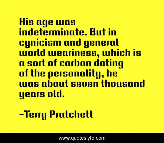 This page presents the quote "His age was indeterminate. But in cynicism and general world weariness, which is a sort of carbon dating of the personality, he was about seven thousand years old.". Author of this quote is Terry Pratchett. This quote is about aging, age, humor, cynicism,.