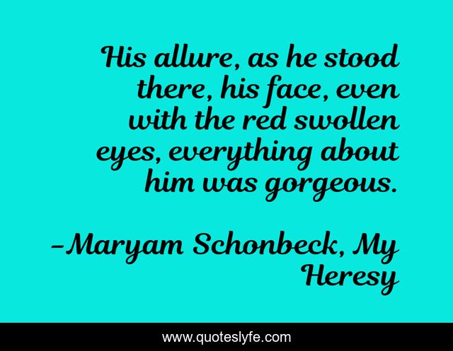 This page presents the quote "His allure, as he stood there, his face, even with the red swollen eyes, everything about him was gorgeous.". Author of this quote is Maryam Schonbeck, My Heresy. This quote is about impossible, young-adults, love, affection, fiction,.