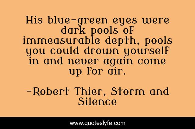 This page presents the quote "His blue-green eyes were dark pools of immeasurable depth, pools you could drown yourself in and never again come up for air.". Author of this quote is Robert Thier, Storm and Silence. This quote is about beautiful, romance, eyes,.