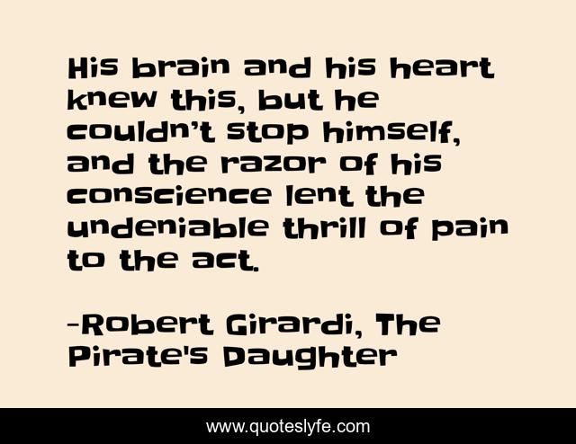 This page presents the quote "His brain and his heart knew this, but he couldn’t stop himself, and the razor of his conscience lent the undeniable thrill of pain to the act.". Author of this quote is Robert Girardi, The Pirate's Daughter. .