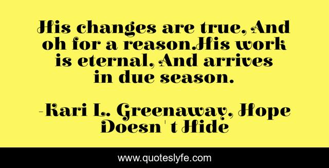 This page presents the quote "His changes are true, And oh for a reason.His work is eternal, And arrives in due season.". Author of this quote is Kari L. Greenaway, Hope Doesn't Hide. This quote is about eternity, change-your-life, jesus,.