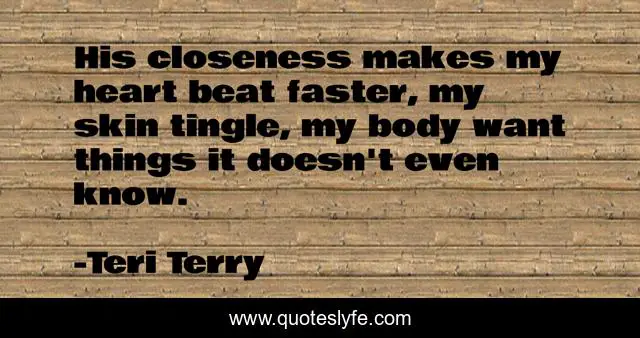 This page presents the quote "His closeness makes my heart beat faster, my skin tingle, my body want things it doesn't even know.". Author of this quote is Teri Terry. This quote is about body, heart, lovers, love, touch, affection,.