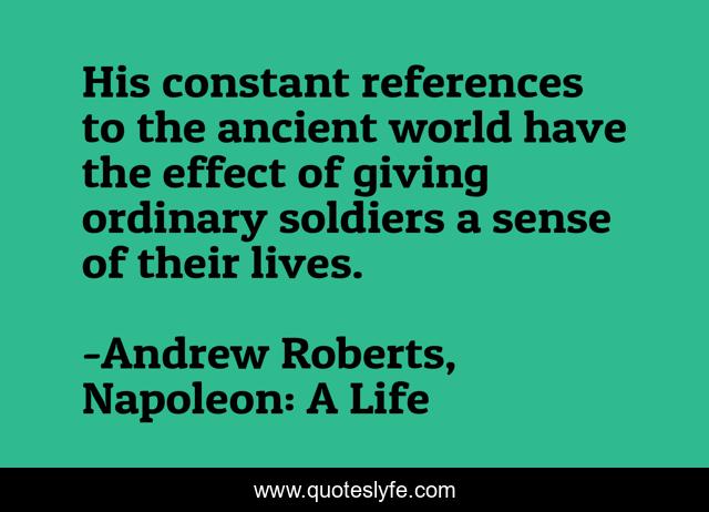 This page presents the quote "His constant references to the ancient world have the effect of giving ordinary soldiers a sense of their lives.". Author of this quote is Andrew Roberts, Napoleon: A Life. This quote is about motivation, leadership, perspective, history,.