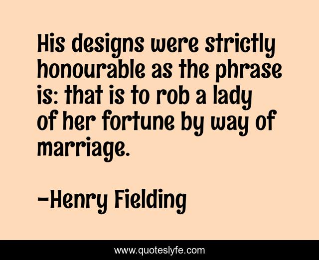 This page presents the quote "His designs were strictly honourable as the phrase is: that is to rob a lady of her fortune by way of marriage.". Author of this quote is Henry Fielding. .
