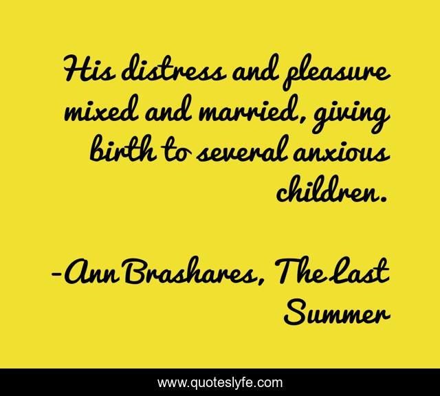 This page presents the quote "His distress and pleasure mixed and married, giving birth to several anxious children.". Author of this quote is Ann Brashares, The Last Summer. This quote is about pleasure, distress,.