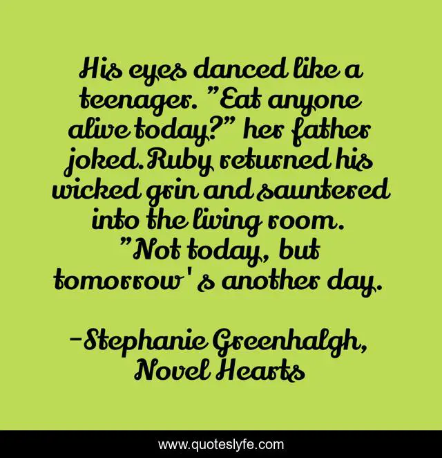 This page presents the quote "His eyes danced like a teenager. "Eat anyone alive today?" her father joked.Ruby returned his wicked grin and sauntered into the living room. "Not today, but tomorrow's another day.". Author of this quote is Stephanie Greenhalgh, Novel Hearts. This quote is about love, vampires, paranormal, valentine, romance, greek, supernatural, unrequited-love, zombies,.