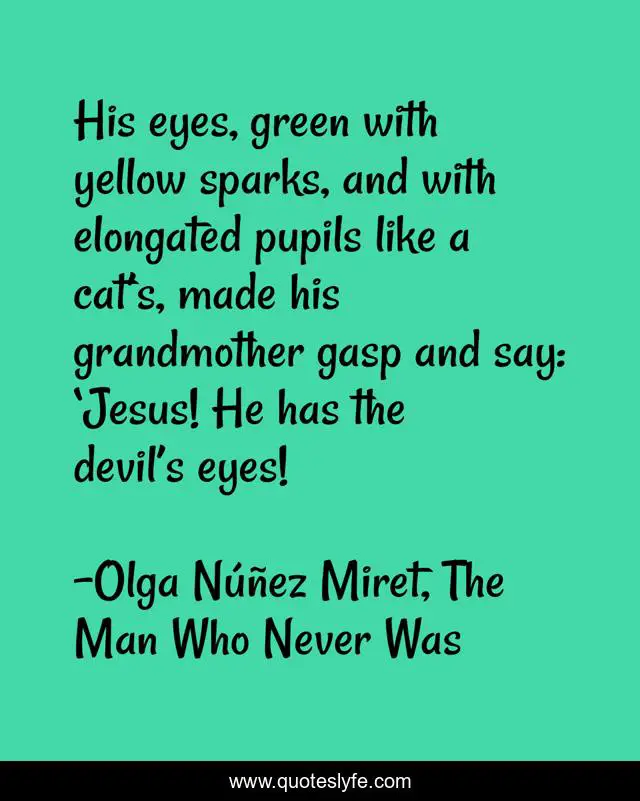 This page presents the quote "His eyes, green with yellow sparks, and with elongated pupils like a cat’s, made his grandmother gasp and say: ‘Jesus! He has the devil’s eyes!". Author of this quote is Olga Núñez Miret, The Man Who Never Was. .