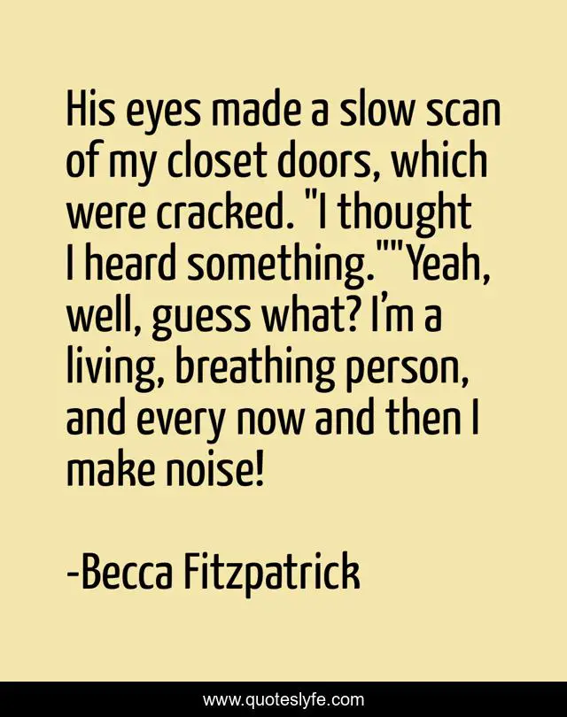 This page presents the quote "His eyes made a slow scan of my closet doors, which were cracked. "I thought I heard something.""Yeah, well, guess what? I’m a living, breathing person, and every now and then I make noise!". Author of this quote is Becca Fitzpatrick. .