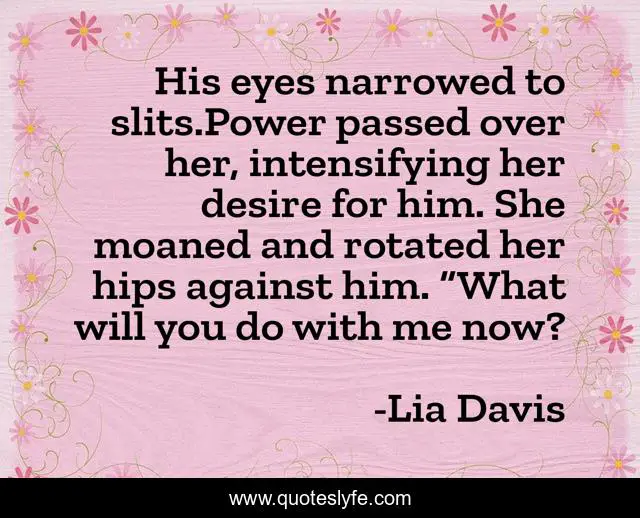 This page presents the quote "His eyes narrowed to slits.Power passed over her, intensifying her desire for him. She moaned and rotated her hips against him. “What will you do with me now?". Author of this quote is Lia Davis. This quote is about one-night-stand, 1ns, 1nightstand, vampire, ravished-before-sunrise,.