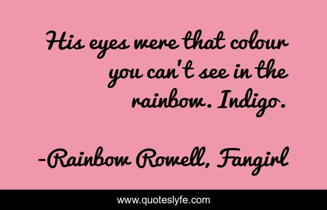 This page presents the quote "His eyes were that colour you can't see in the rainbow. Indigo.". Author of this quote is Rainbow Rowell, Fangirl. This quote is about rainbow, colour, indigo, eyes,.