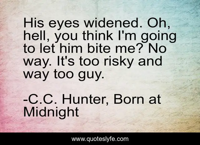 This page presents the quote "His eyes widened. Oh, hell, you think I'm going to let him bite me? No way. It's too risky and way too guy.". Author of this quote is C.C. Hunter, Born at Midnight. This quote is about funny, born-at-midnight, comedy,.