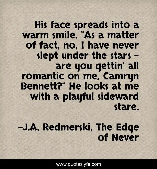 This page presents the quote "His face spreads into a warm smile. “As a matter of fact, no, I have never slept under the stars – are you gettin’ all romantic on me, Camryn Bennett?” He looks at me with a playful sideward stare.". Author of this quote is J.A. Redmerski, The Edge of Never. This quote is about sleep-under-the-stars, j-a-redmerski, romantic, camryn-bennett, camryn-and-andrew, andrew-parrish, the-edge-of-never,.
