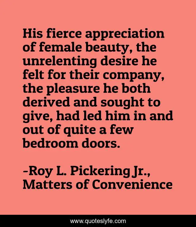 This page presents the quote "His fierce appreciation of female beauty, the unrelenting desire he felt for their company, the pleasure he both derived and sought to give, had led him in and out of quite a few bedroom doors.". Author of this quote is Roy L. Pickering Jr., Matters of Convenience. This quote is about upmarket-commercial-fiction, novel, mainstream, african-american, kindle-scout, contemporary, fiction, literary, women-s-issues,.