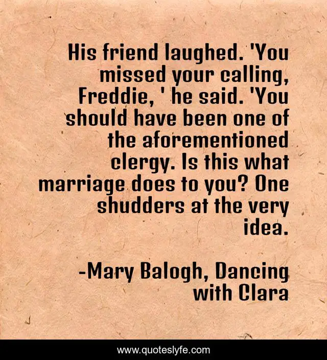 This page presents the quote "His friend laughed. 'You missed your calling, Freddie, ' he said. 'You should have been one of the aforementioned clergy. Is this what marriage does to you? One shudders at the very idea.". Author of this quote is Mary Balogh, Dancing with Clara. This quote is about regency-romance, dialogue, humor, clergy, mary-balogh, regency, romance, marriage, witty-banter,.