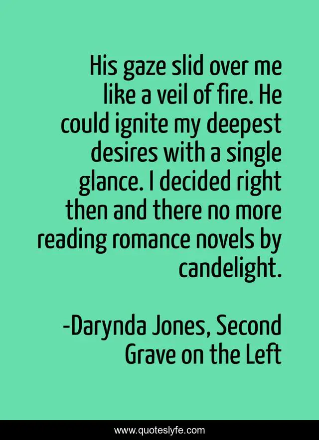 This page presents the quote "His gaze slid over me like a veil of fire. He could ignite my deepest desires with a single glance. I decided right then and there no more reading romance novels by candelight.". Author of this quote is Darynda Jones, Second Grave on the Left. This quote is about humor, romance-novels,.