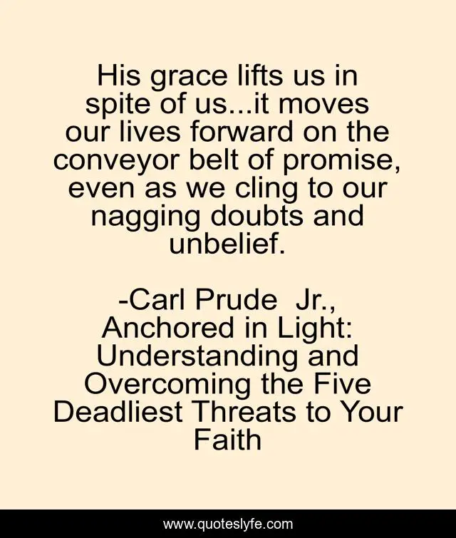This page presents the quote "His grace lifts us in spite of us...it moves our lives forward on the conveyor belt of promise, even as we cling to our nagging doubts and unbelief.". Author of this quote is Carl Prude Jr., Anchored in Light: Understanding and Overcoming the Five Deadliest Threats to Your Faith. This quote is about unbelief, doubt, grace, anchored-in-light,.