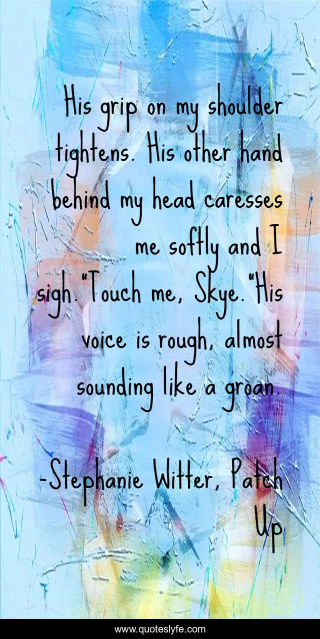 This page presents the quote "His grip on my shoulder tightens. His other hand behind my head caresses me softly and I sigh."Touch me, Skye."His voice is rough, almost sounding like a groan.". Author of this quote is Stephanie Witter, Patch Up. This quote is about drama, new-adult, contemporary, contemporary-romance,.