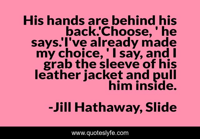 This page presents the quote "His hands are behind his back.'Choose, ' he says.'I've already made my choice, ' I say, and I grab the sleeve of his leather jacket and pull him inside.". Author of this quote is Jill Hathaway, Slide. This quote is about cute, choices,.