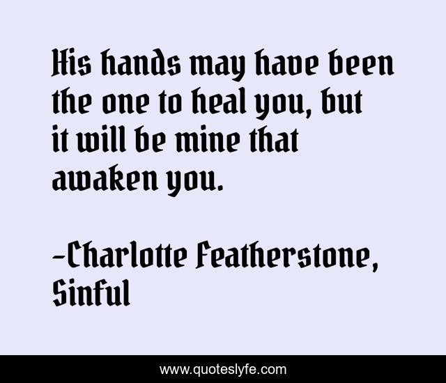 This page presents the quote "His hands may have been the one to heal you, but it will be mine that awaken you.". Author of this quote is Charlotte Featherstone, Sinful. This quote is about romance, love, affection,.