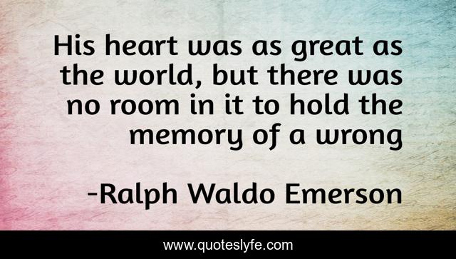 This page presents the quote "His heart was as great as the world, but there was no room in it to hold the memory of a wrong". Author of this quote is Ralph Waldo Emerson. .