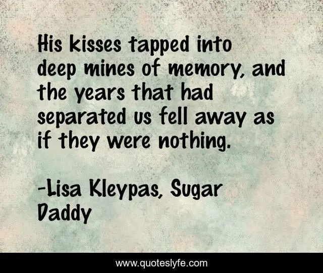 This page presents the quote "His kisses tapped into deep mines of memory, and the years that had separated us fell away as if they were nothing.". Author of this quote is Lisa Kleypas, Sugar Daddy. This quote is about love, liberty, sugar-daddy, hardy, kiss, affection,.