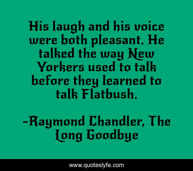 This page presents the quote "His laugh and his voice were both pleasant. He talked the way New Yorkers used to talk before they learned to talk Flatbush.". Author of this quote is Raymond Chandler, The Long Goodbye. This quote is about brooklyn, new-york-city, humor,.