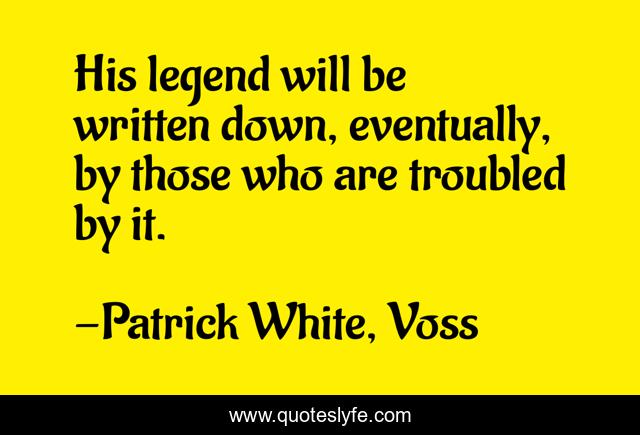 This page presents the quote "His legend will be written down, eventually, by those who are troubled by it.". Author of this quote is Patrick White, Voss. This quote is about history, legends, legacies,.