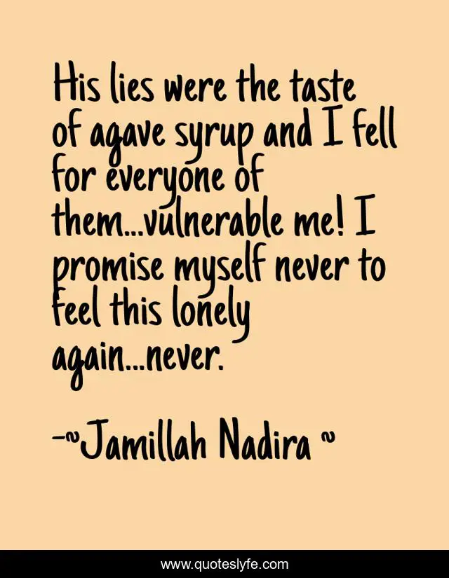 This page presents the quote "His lies were the taste of agave syrup and I fell for everyone of them...vulnerable me! I promise myself never to feel this lonely again...never.". Author of this quote is ~Jamillah Nadira ~. This quote is about lonely, promise, vulnerable,.