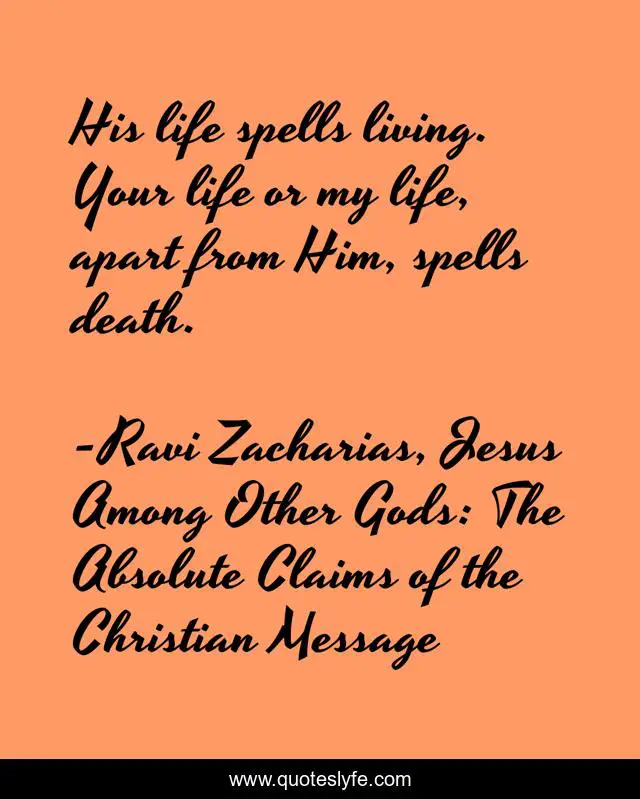 This page presents the quote "His life spells living. Your life or my life, apart from Him, spells death.". Author of this quote is Ravi Zacharias, Jesus Among Other Gods: The Absolute Claims of the Christian Message. This quote is about living, life, death,.