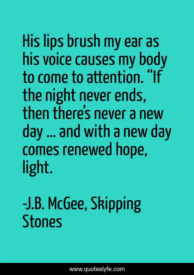 This page presents the quote "His lips brush my ear as his voice causes my body to come to attention. “If the night never ends, then there’s never a new day … and with a new day comes renewed hope, light.". Author of this quote is J.B. McGee, Skipping Stones. This quote is about strength, light, renewed-spirit, new-day, new-hope, inspirational-love-story, hope,.