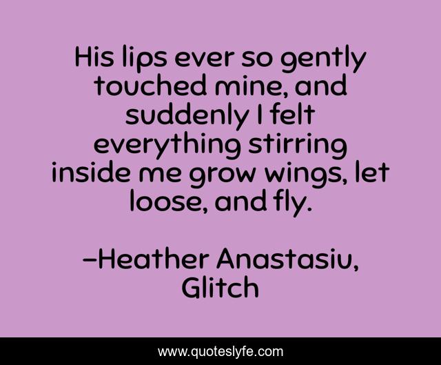 This page presents the quote "His lips ever so gently touched mine, and suddenly I felt everything stirring inside me grow wings, let loose, and fly.". Author of this quote is Heather Anastasiu, Glitch. This quote is about falling-in-love, love, feeling-infinite, being-in-love, kiss, kissing, in-love, affection,.