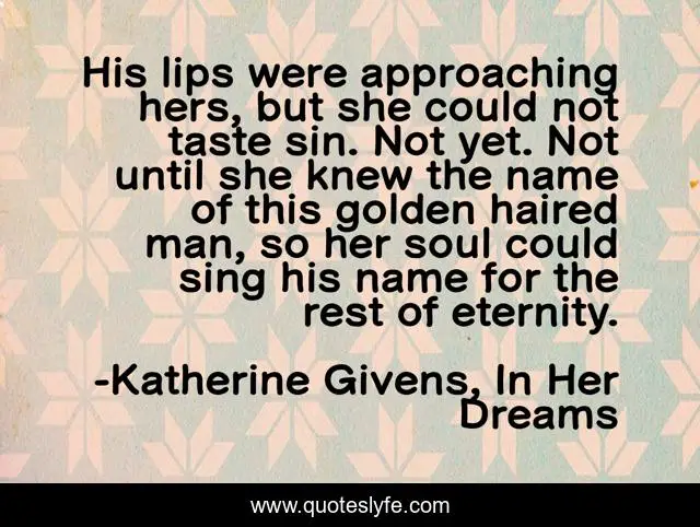This page presents the quote "His lips were approaching hers, but she could not taste sin. Not yet. Not until she knew the name of this golden haired man, so her soul could sing his name for the rest of eternity.". Author of this quote is Katherine Givens, In Her Dreams. This quote is about katherine-givens, love, historical-romance, romance, in-her-dreams, kiss, affection,.